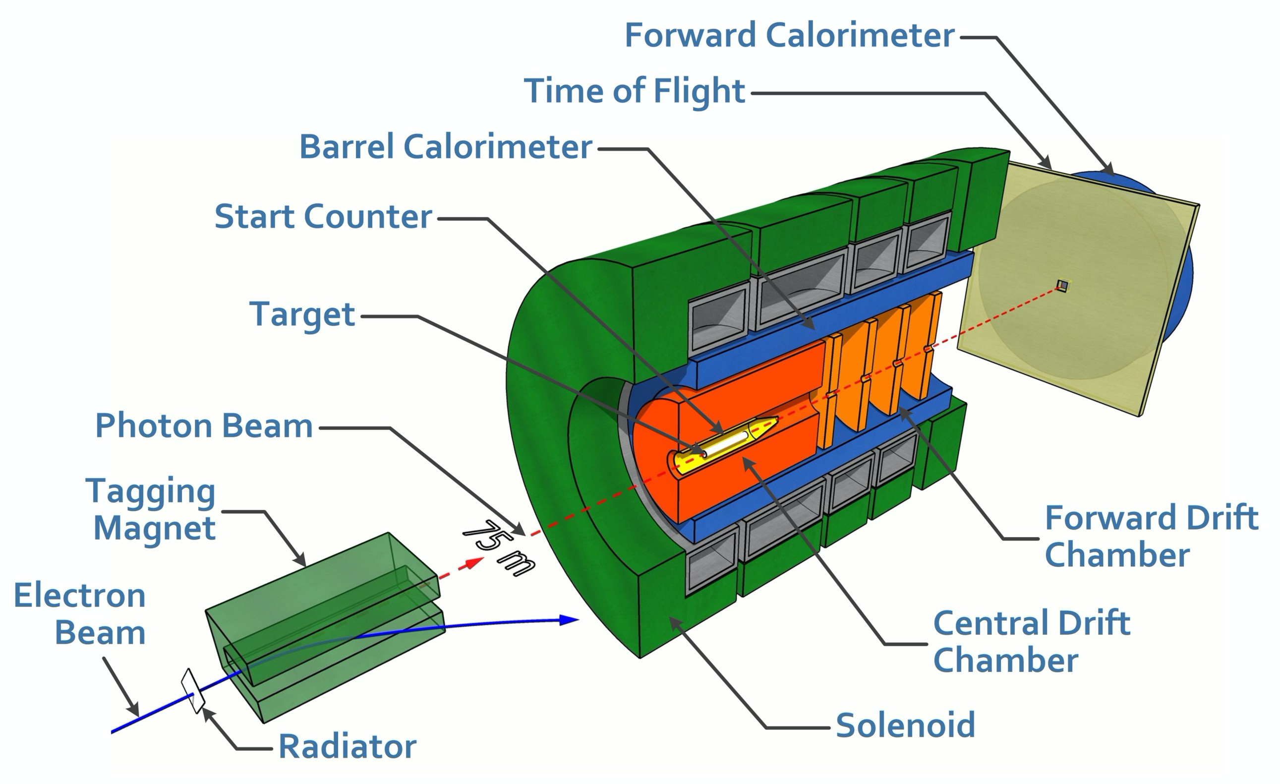 Below is a simplified schematic of the GlueX detector in Hall D: