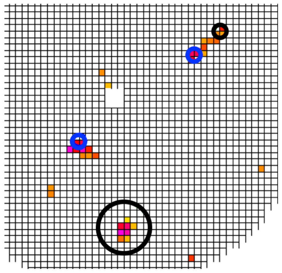 Fig. 4 :caption: This is a typical FCAL Event. Colored blocks show cells registering an energy deposition. Circles indicate showers identified by the reconstruction algorithm, where ther adius of the circle is proportional to the energy of the shower. Different colors represent various candidates (photon, charged or splitoffs). The figure is taken from [1]#